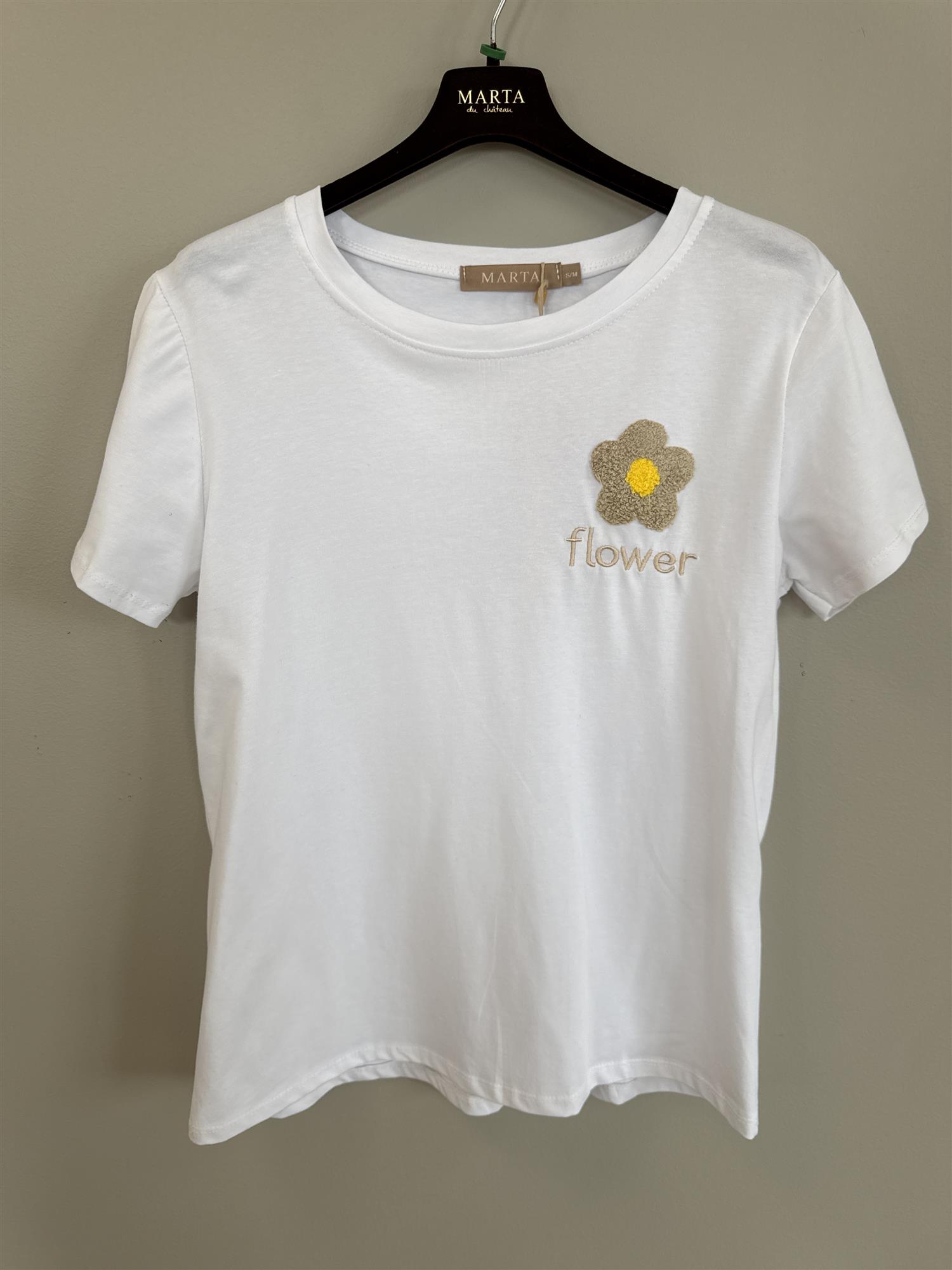 Hvit t-skjorte med beige og gul liten blomst.
