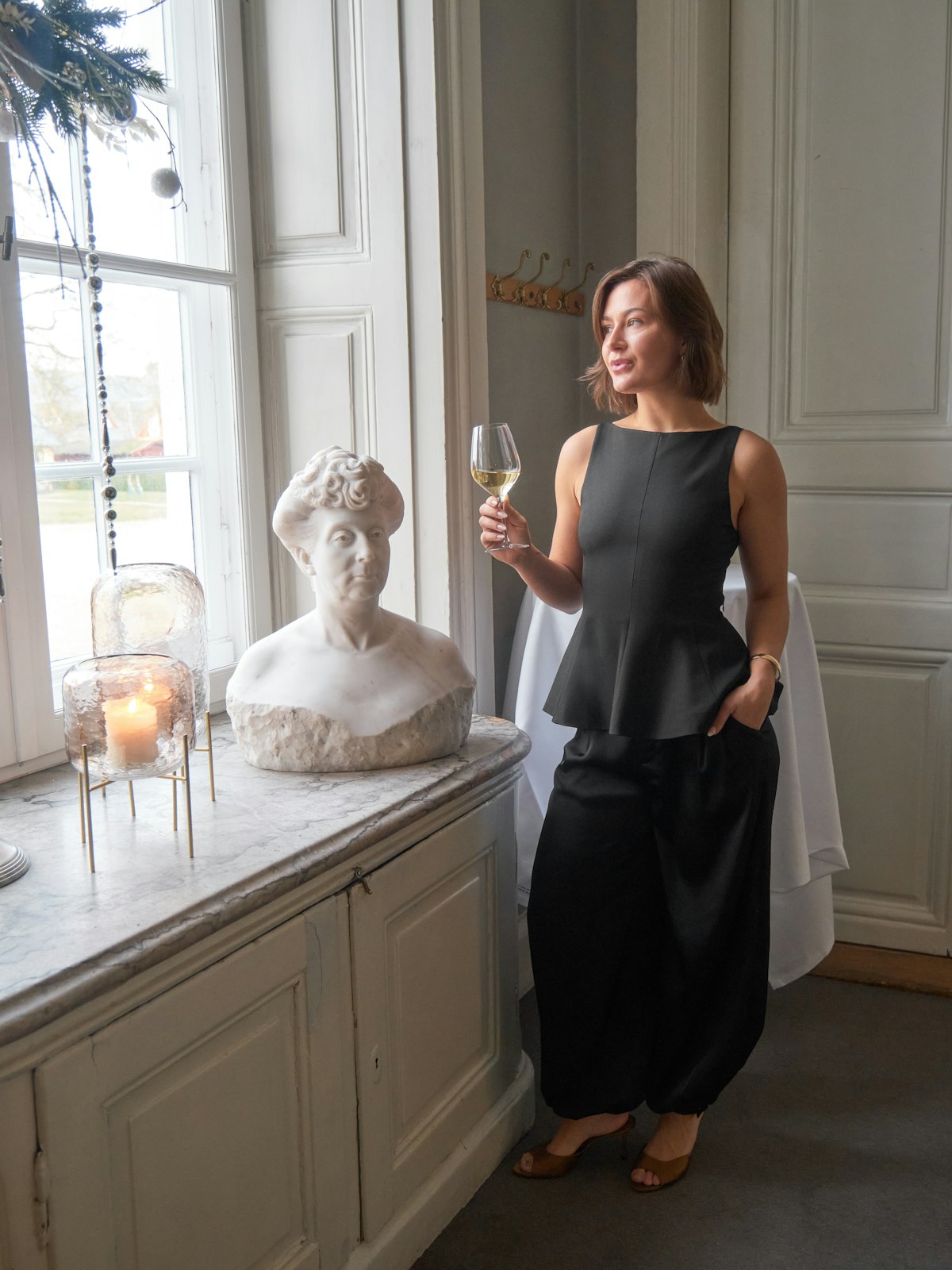 Tettsittende topp med bred bunn. Toppen knytes bak og har åpen rygg. Modellen er 176 cm høy og har på seg størrelse 36.
