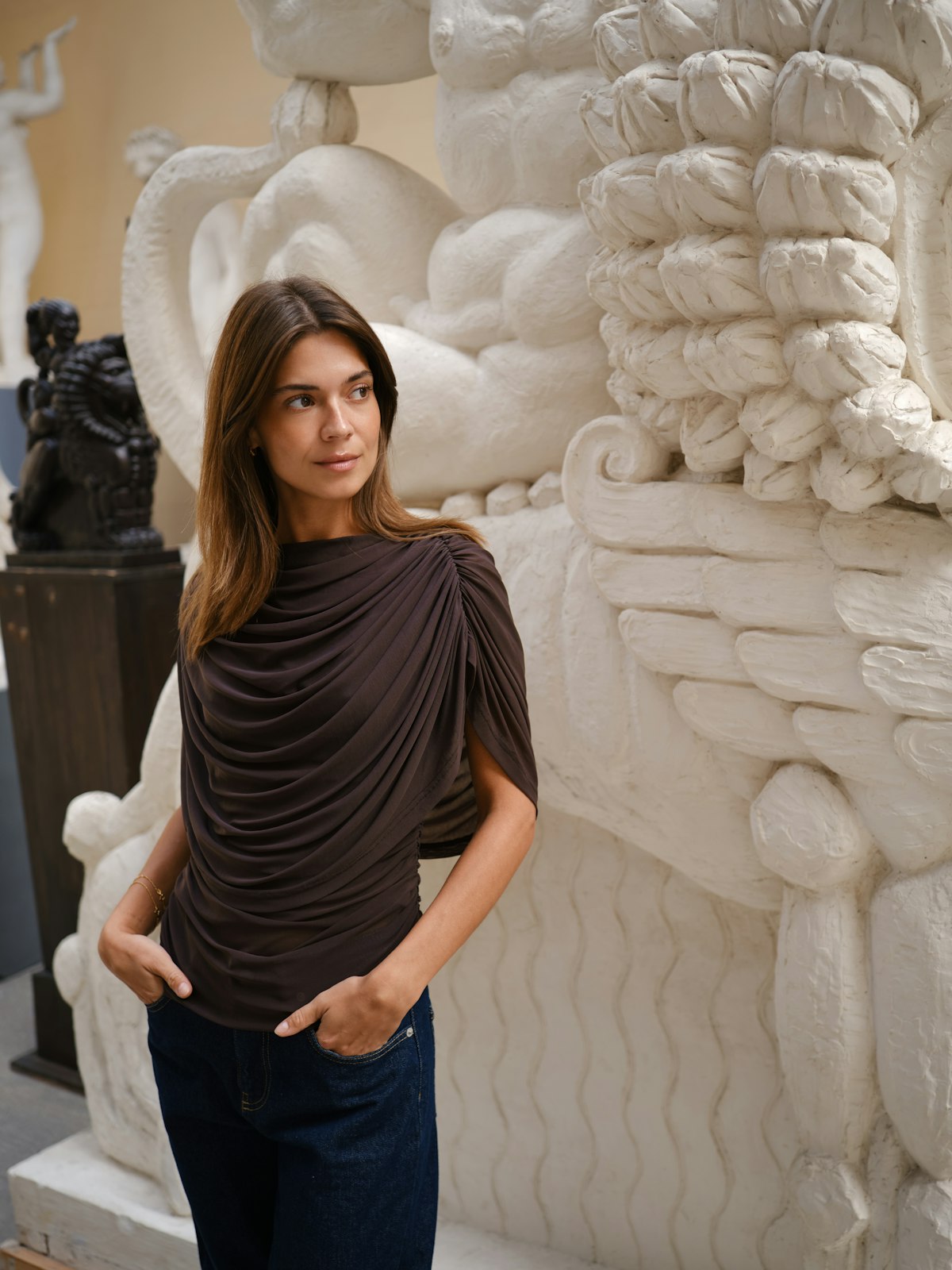 Søt mesh topp med smock langs sidesømmen, og med draperende vannfallseffekt foran på halsen. Modellen er 176 cm høy og bruker størrelse 36.