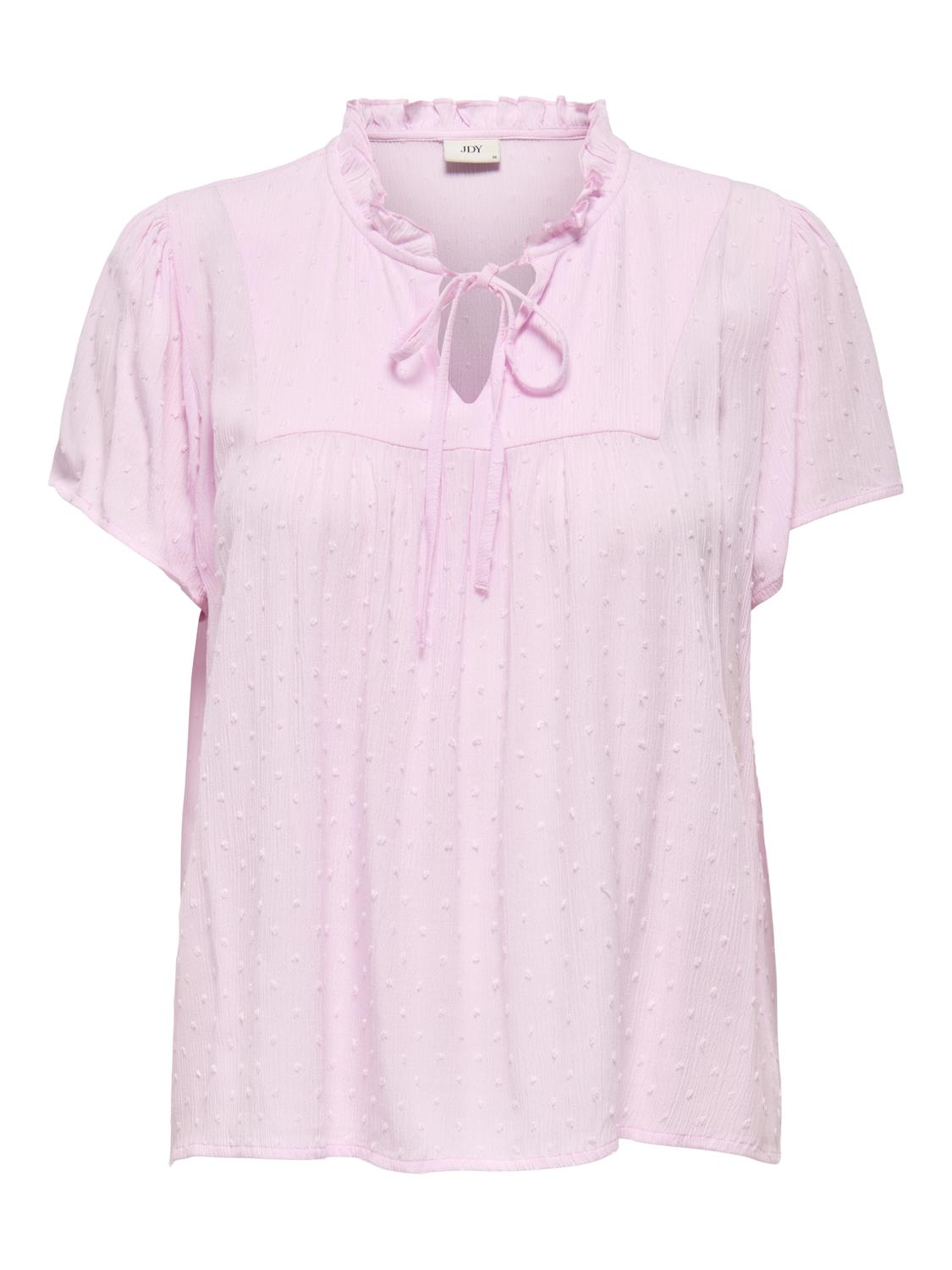 Feminin topp i 100% viskose, et mykt og lett materiale som gir en elegant og silkeaktig følelse. Den har en V-hals, volumermer og en sløyfedetalj som tilfører en ekstra touch av stil.
