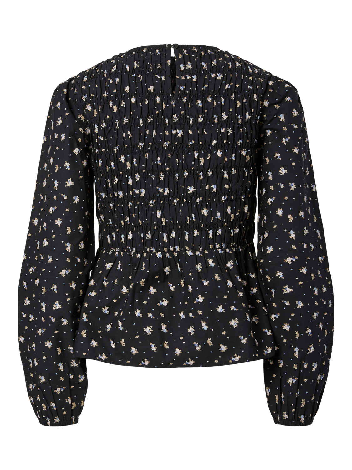 Søt og uformell smock-topp laget av mykt bomullsstoff, perfekt for en avslappet stil. Den har lange volumermer og elastiske mansjetter, noe som gir en behagelig passform. Det delikate printet med sorte blomster gir et friskt preg til antrekket.