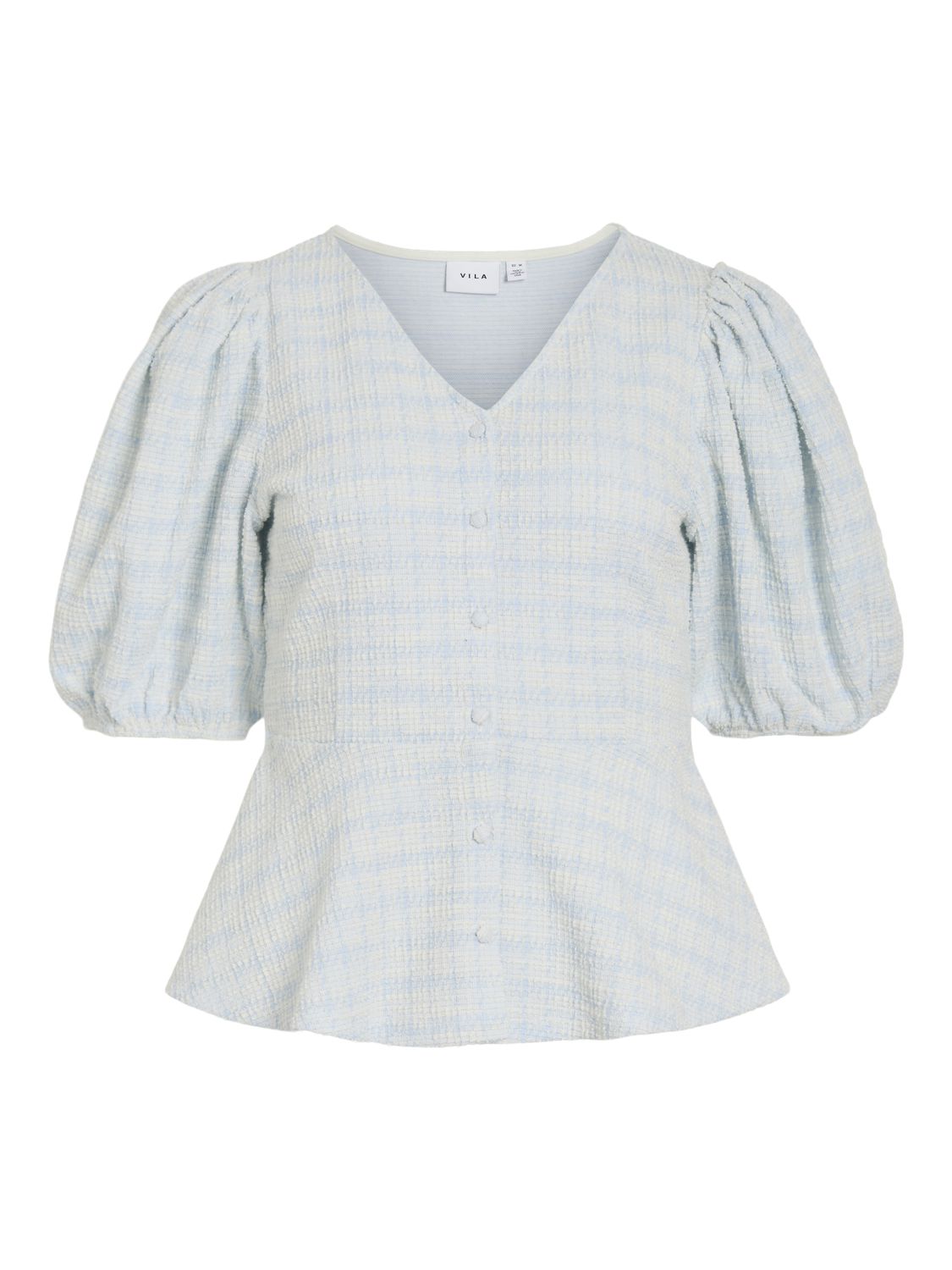 Lyse blå /hvit topp med fin struktur. Peplum, v-hals.