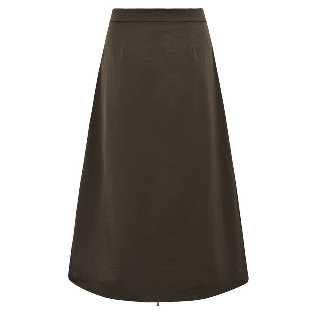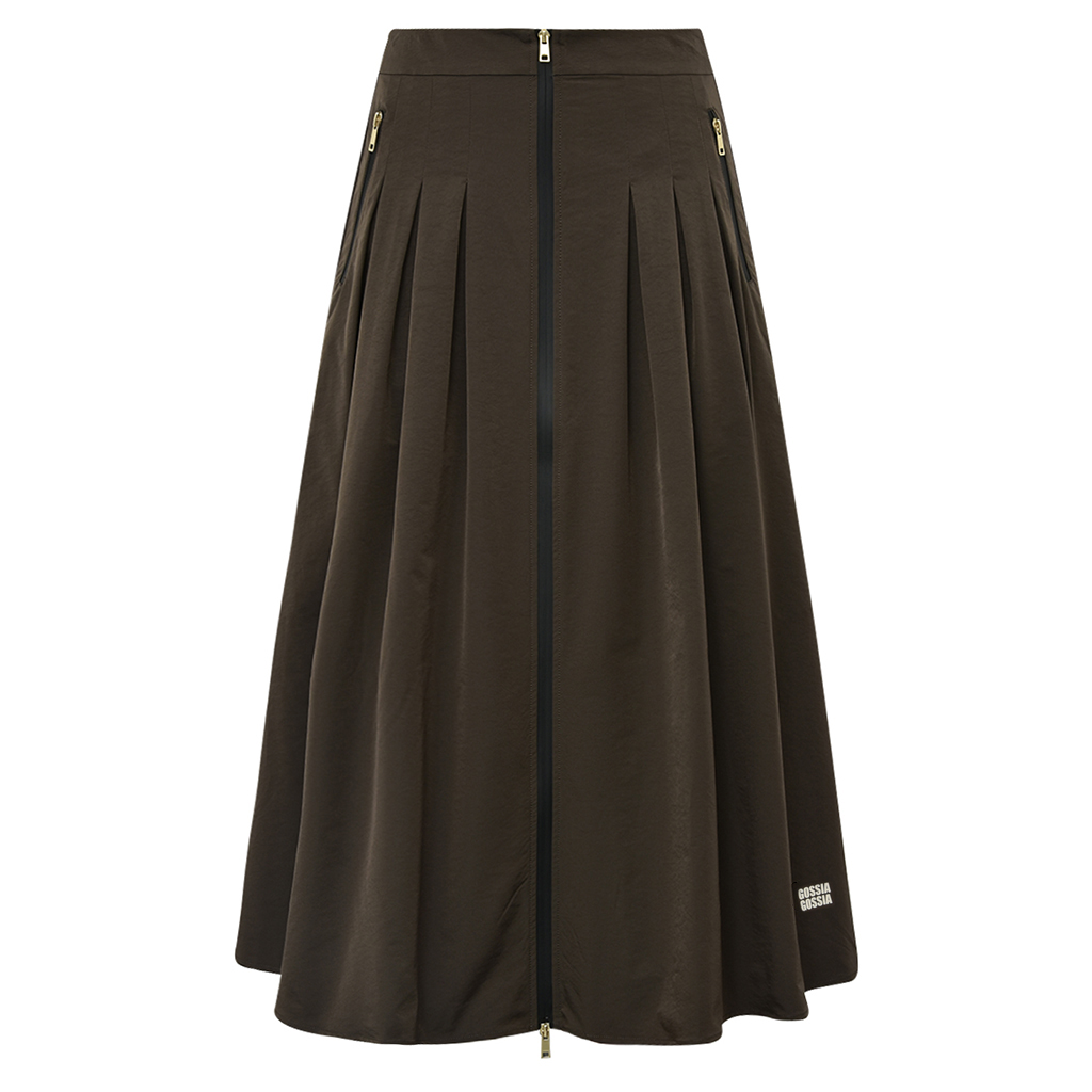 Stilig brunt skjørt i nylon, med 2-veis glidelås samt glidelås på lommer.