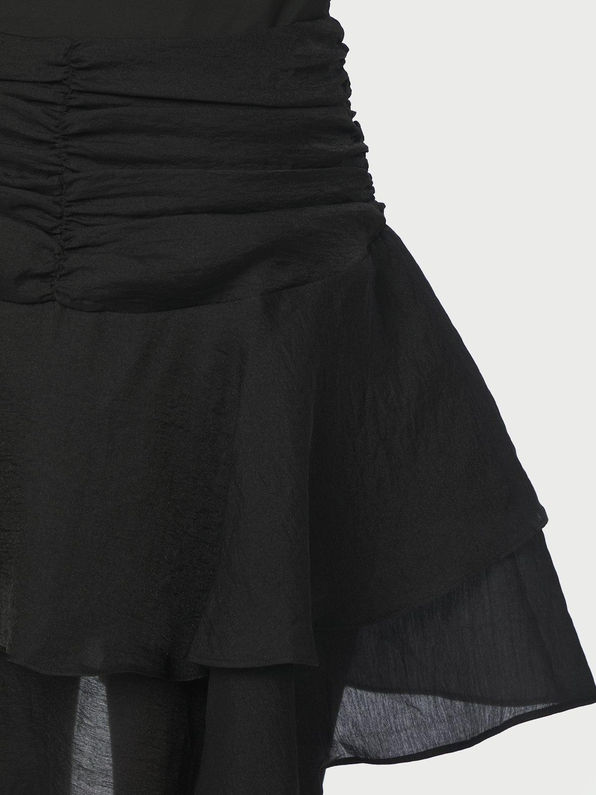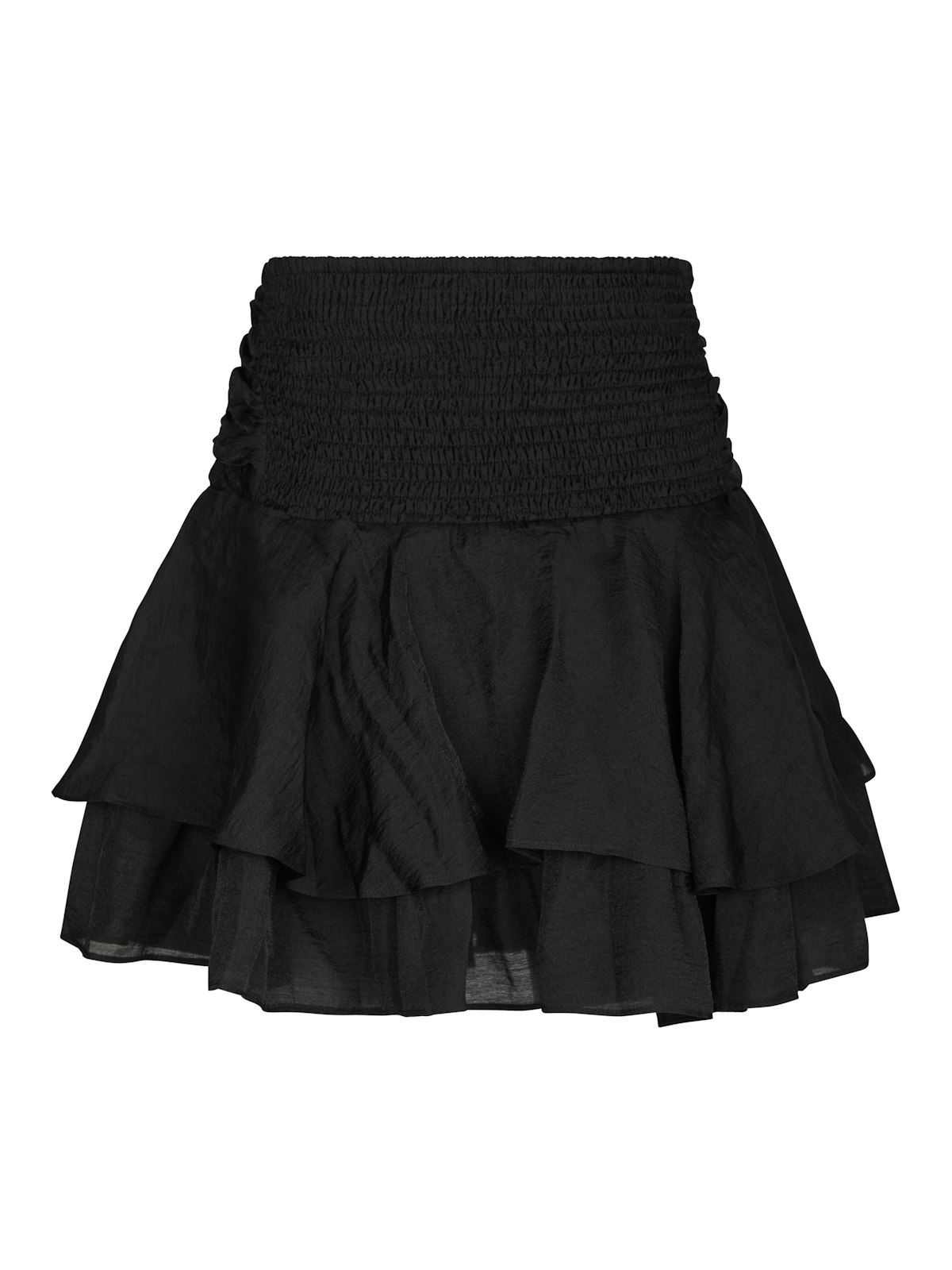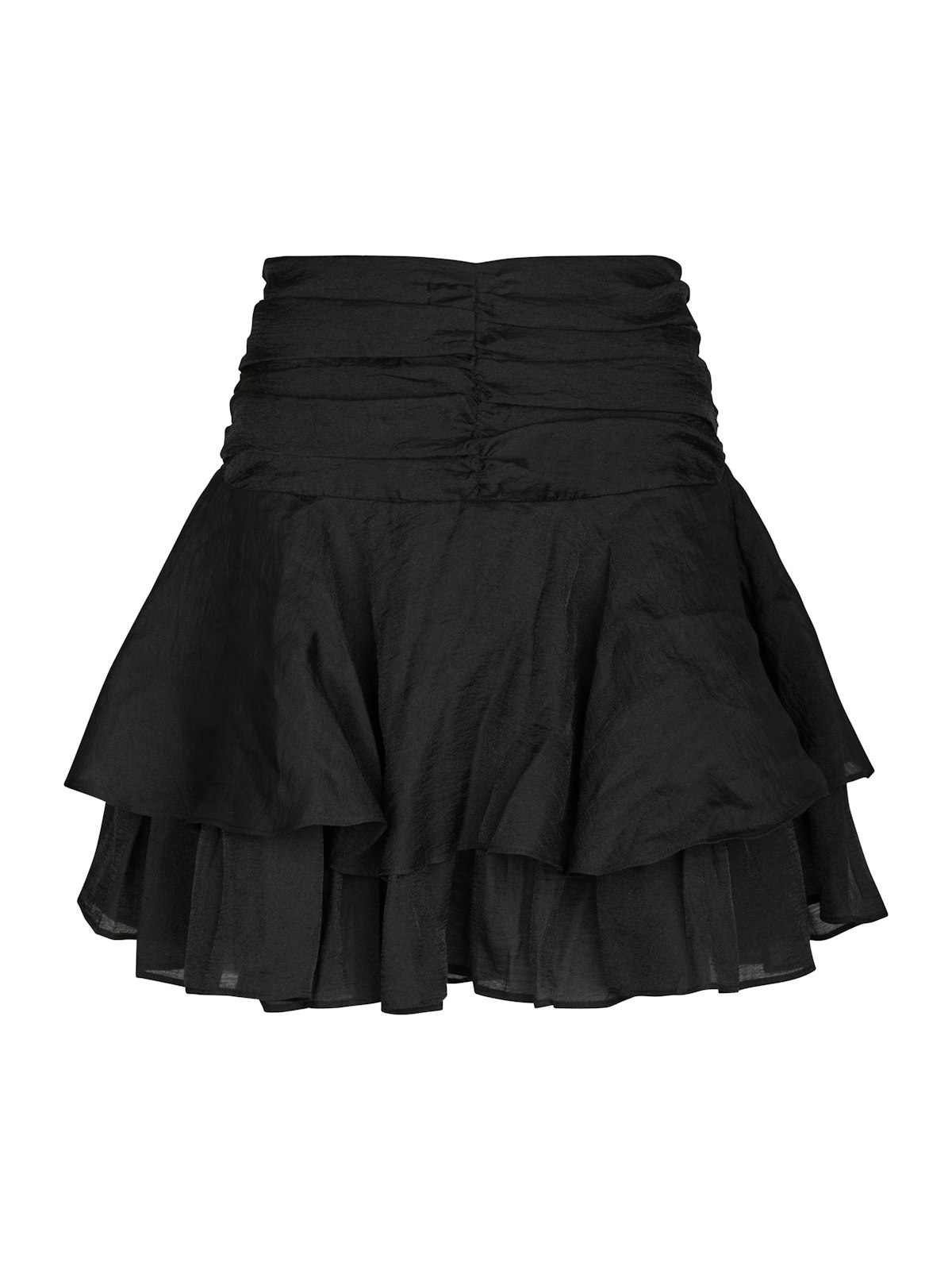 Kort skjørt med en midje med yoke. Det har volanger nederst og elastikk bak. Modellen er 176 cm høy og bruker størrelse 36.
