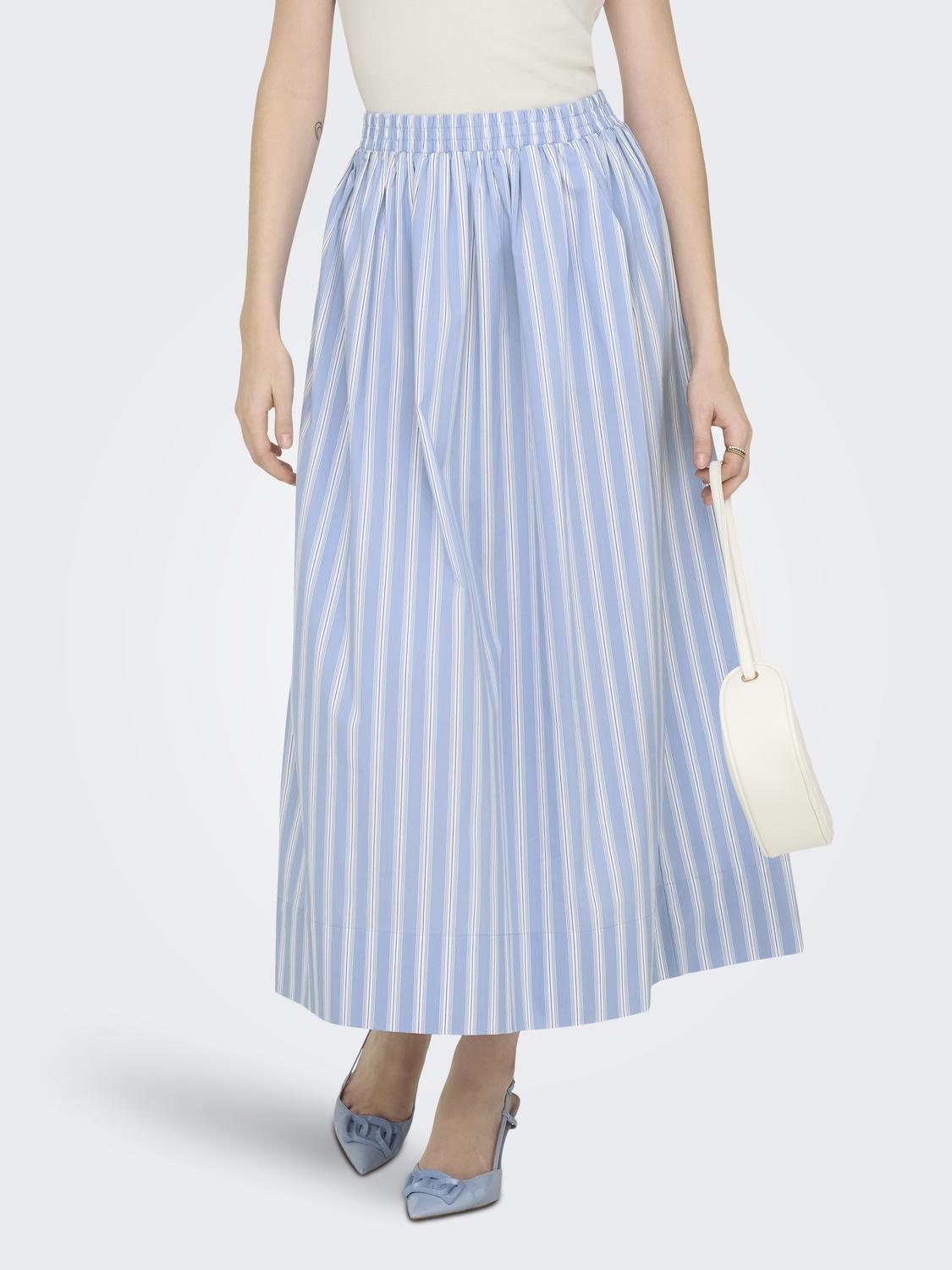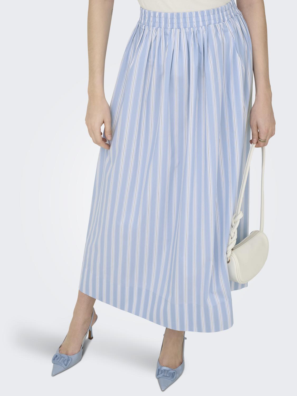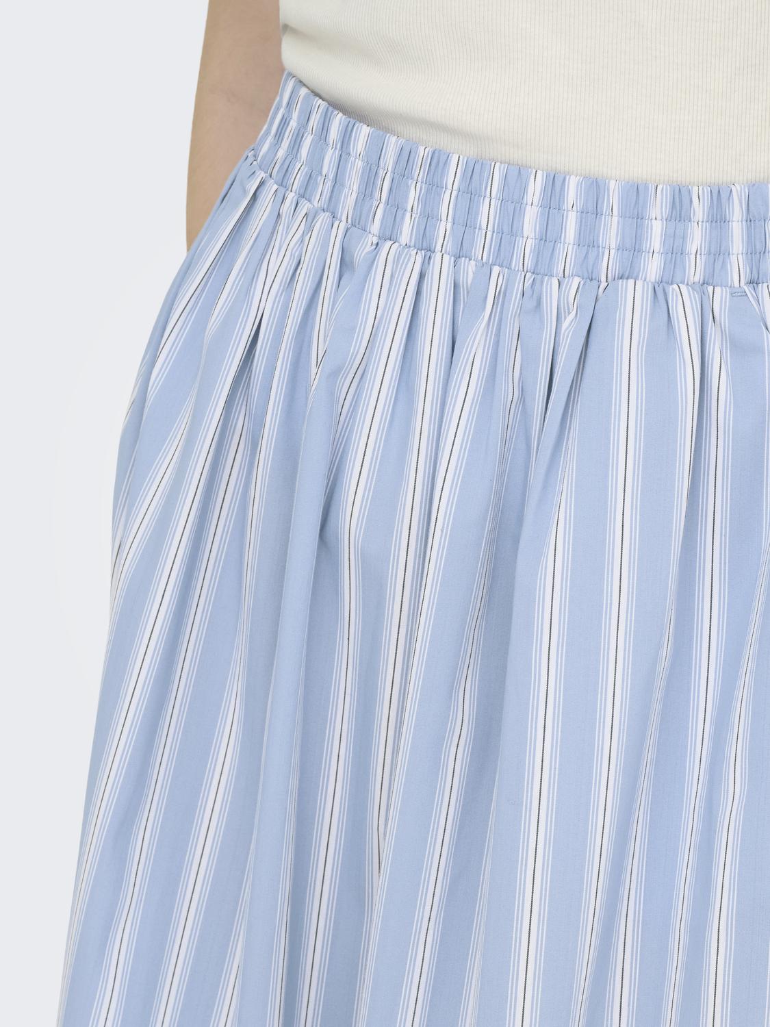 Blått stripete skjørt med strikk i livet og lommer.