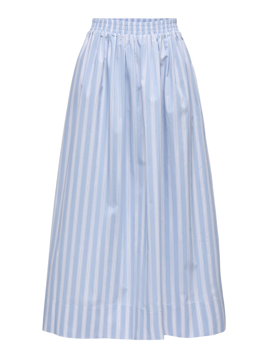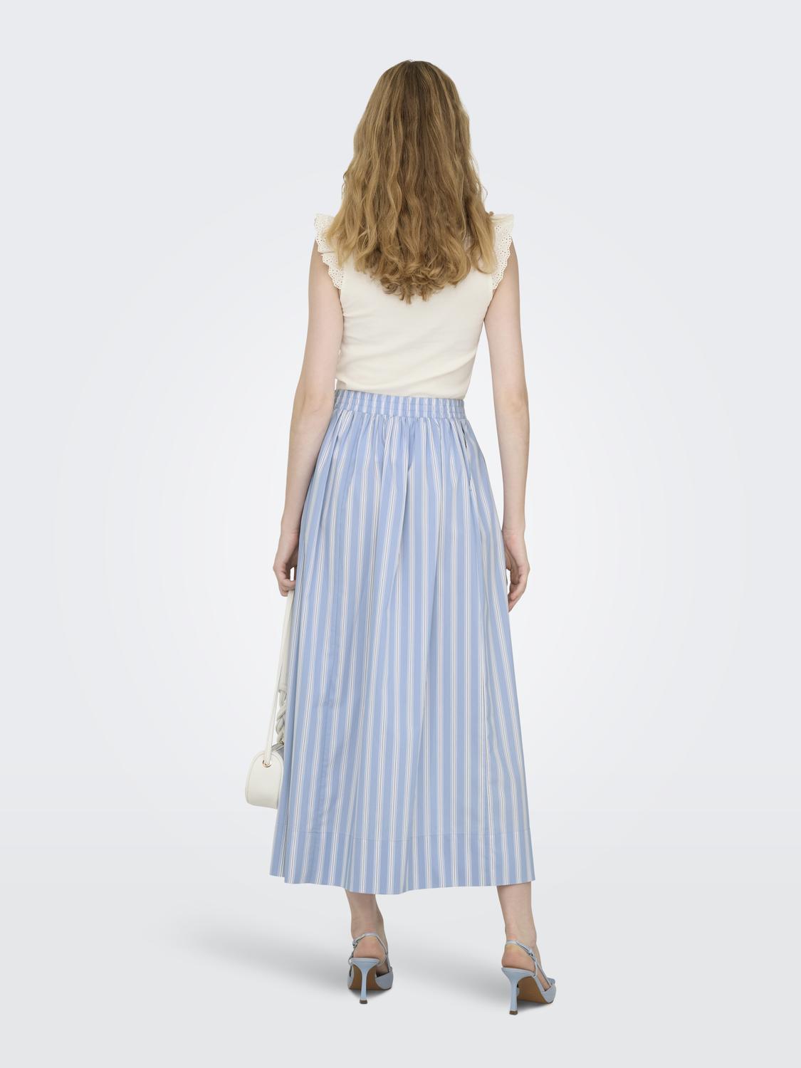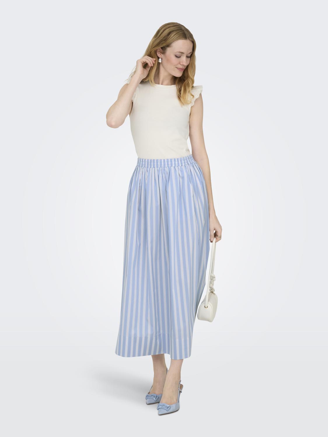 Blått stripete skjørt med strikk i livet og lommer.