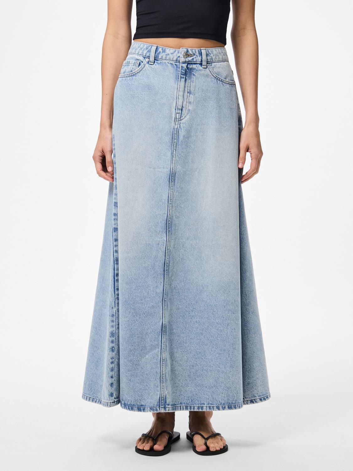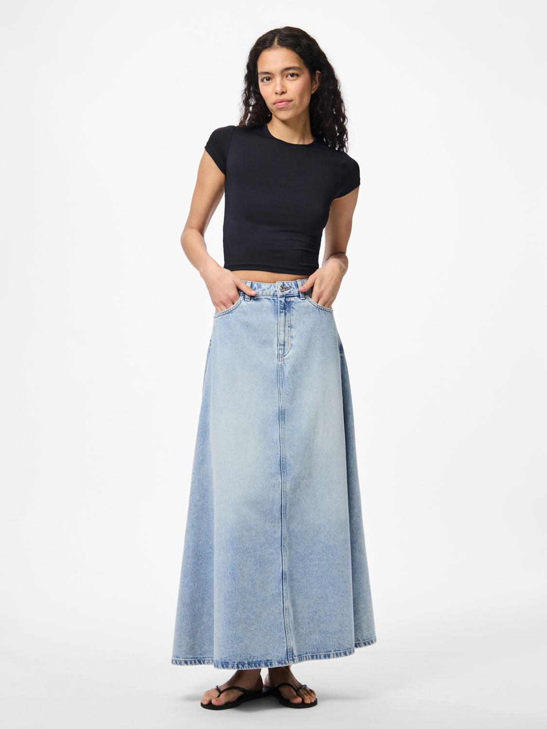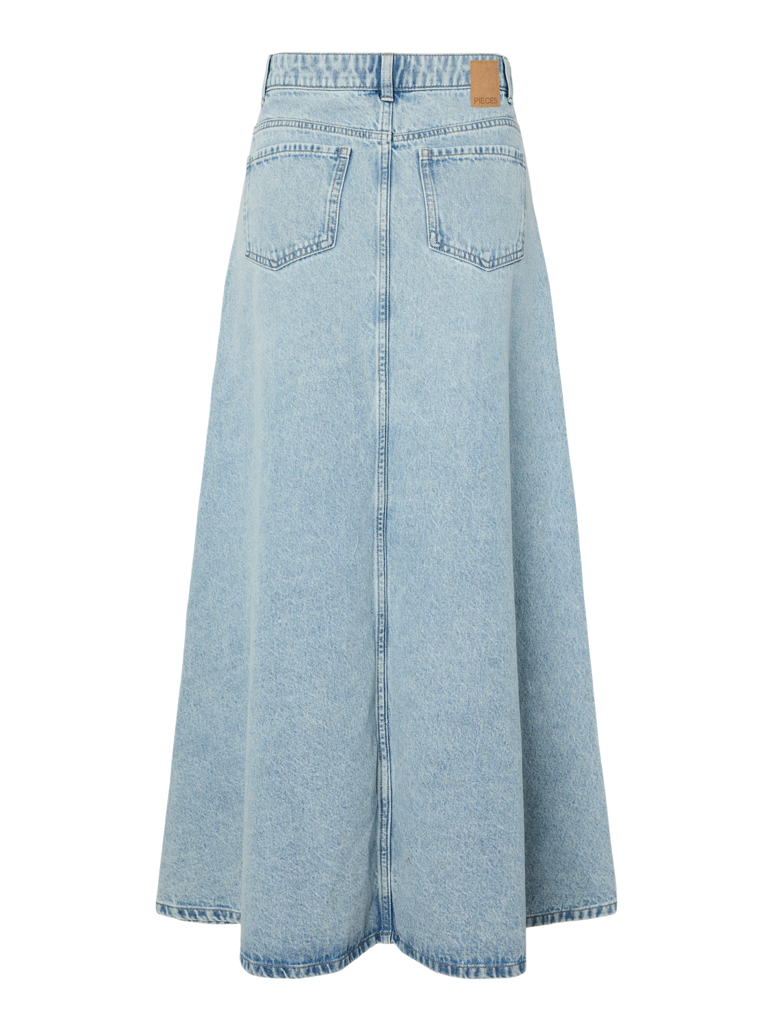 High waist langt denimskjørt. Lommer i siden og a-shape.