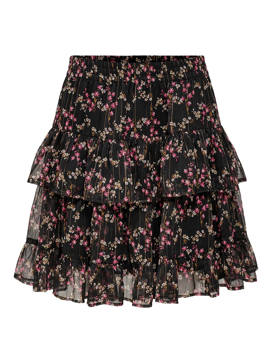 Sort kappeskjørt med små rosa blomster og tynne gullstriper. Skjørtet har strikk i livet.