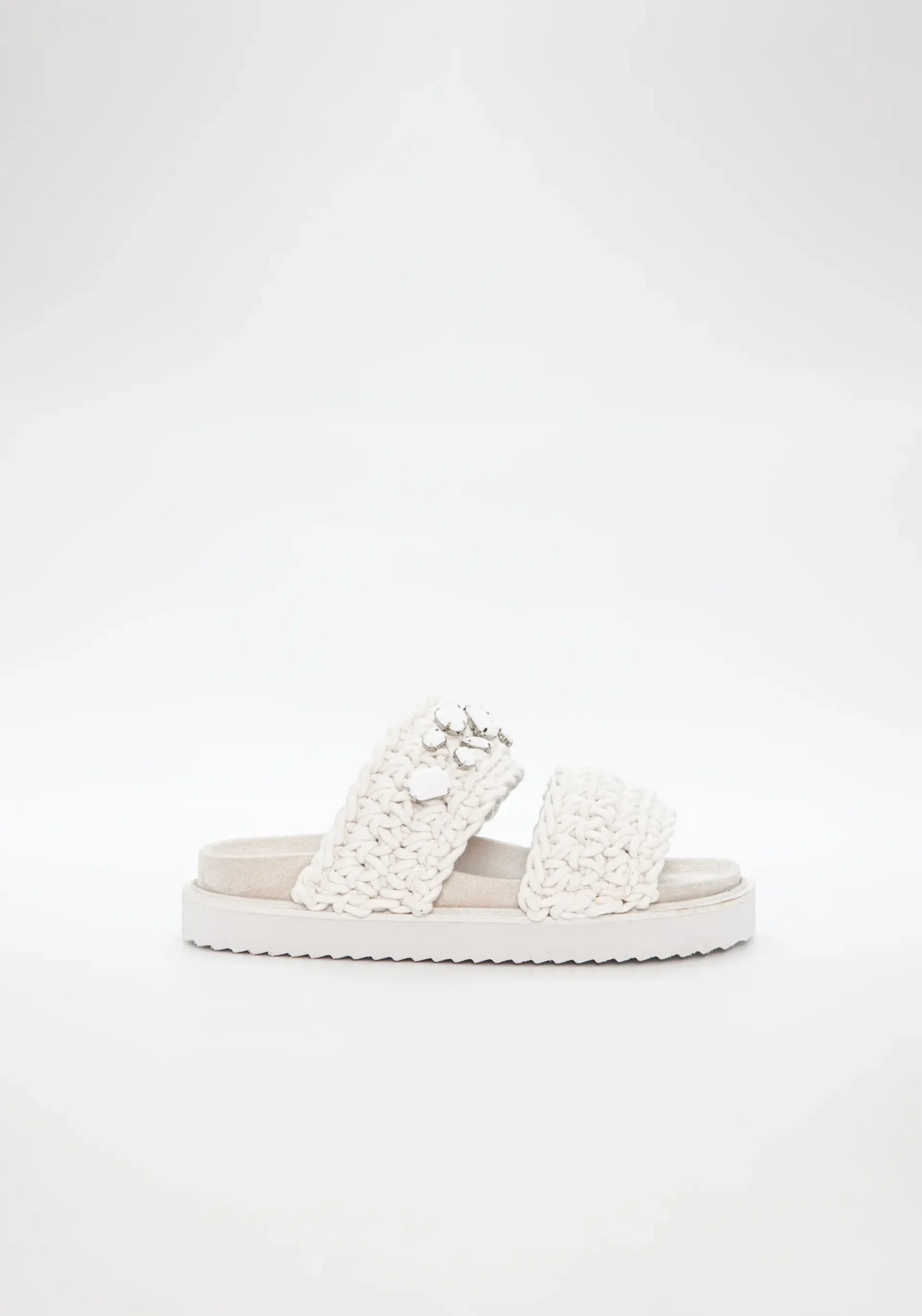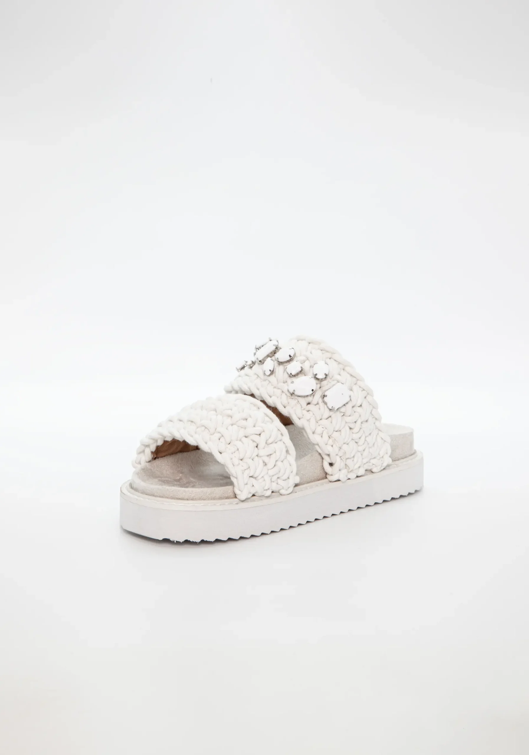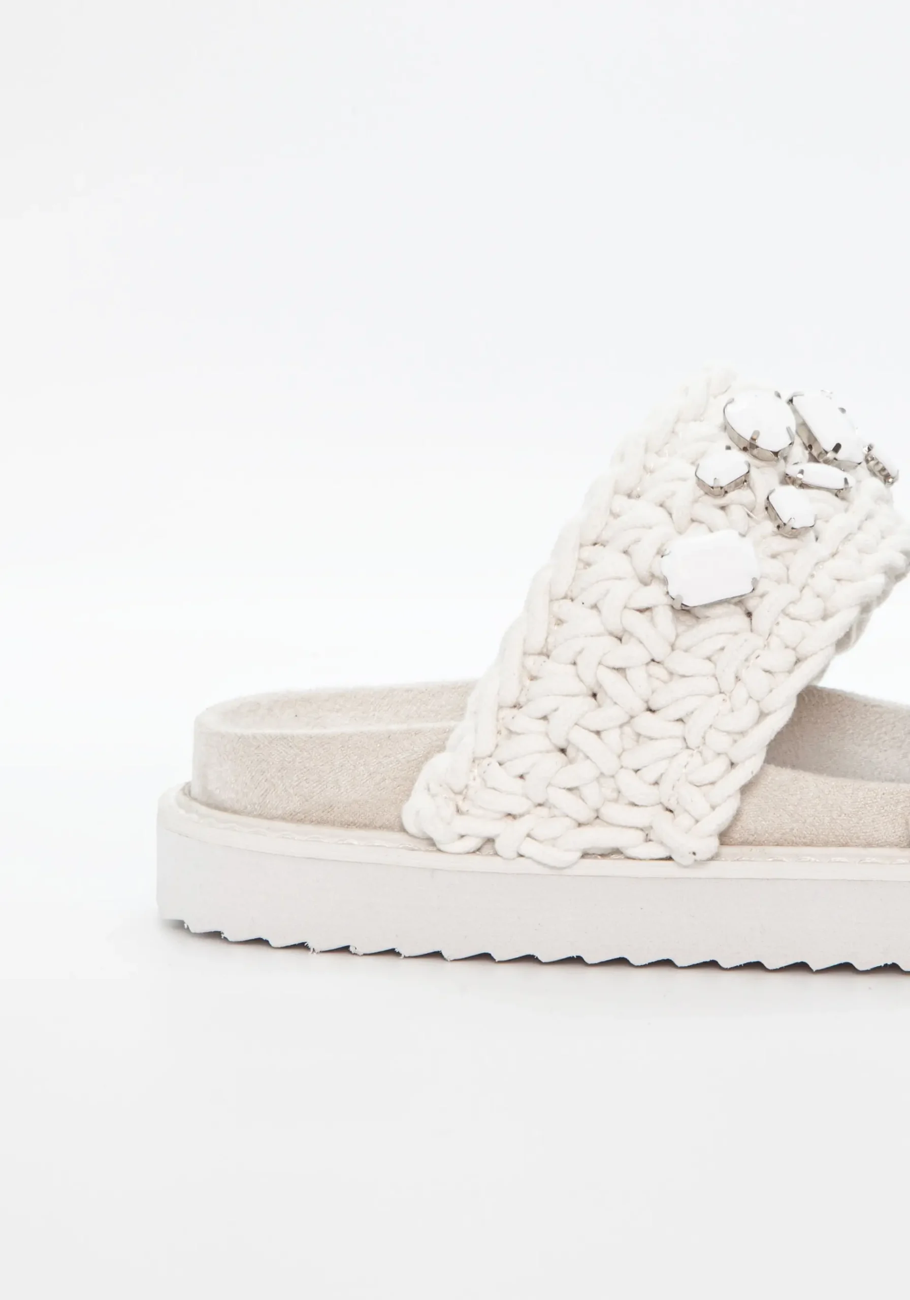 Stilige chunky sandaler, flettet og med blanke stener. Hvit såle.
