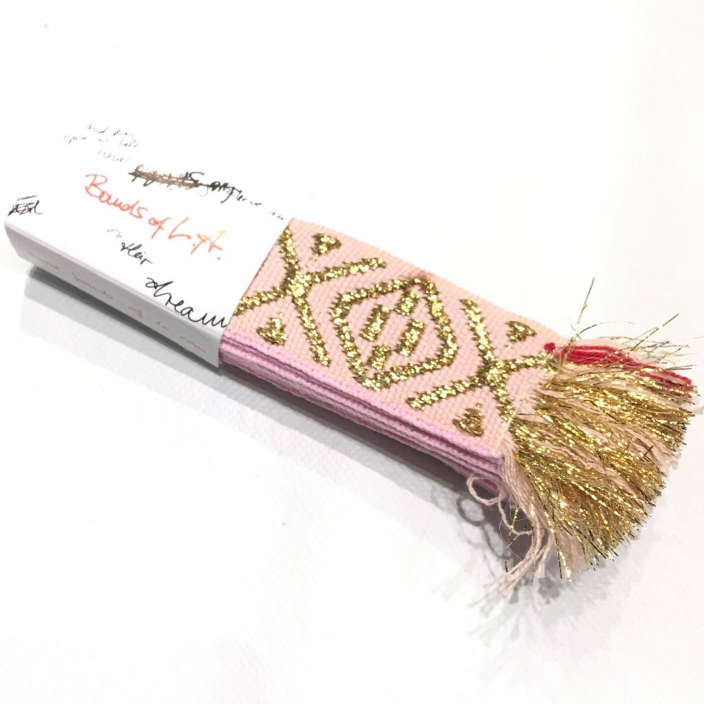 Belte fra Bands of LA. Lys rosa knytebelte med vevde gulltråder – dette er fra «Limited edition-kolleksjonen!» Beltet er i 100% bomull og har lende på 145 cm med frynsekant i endene.