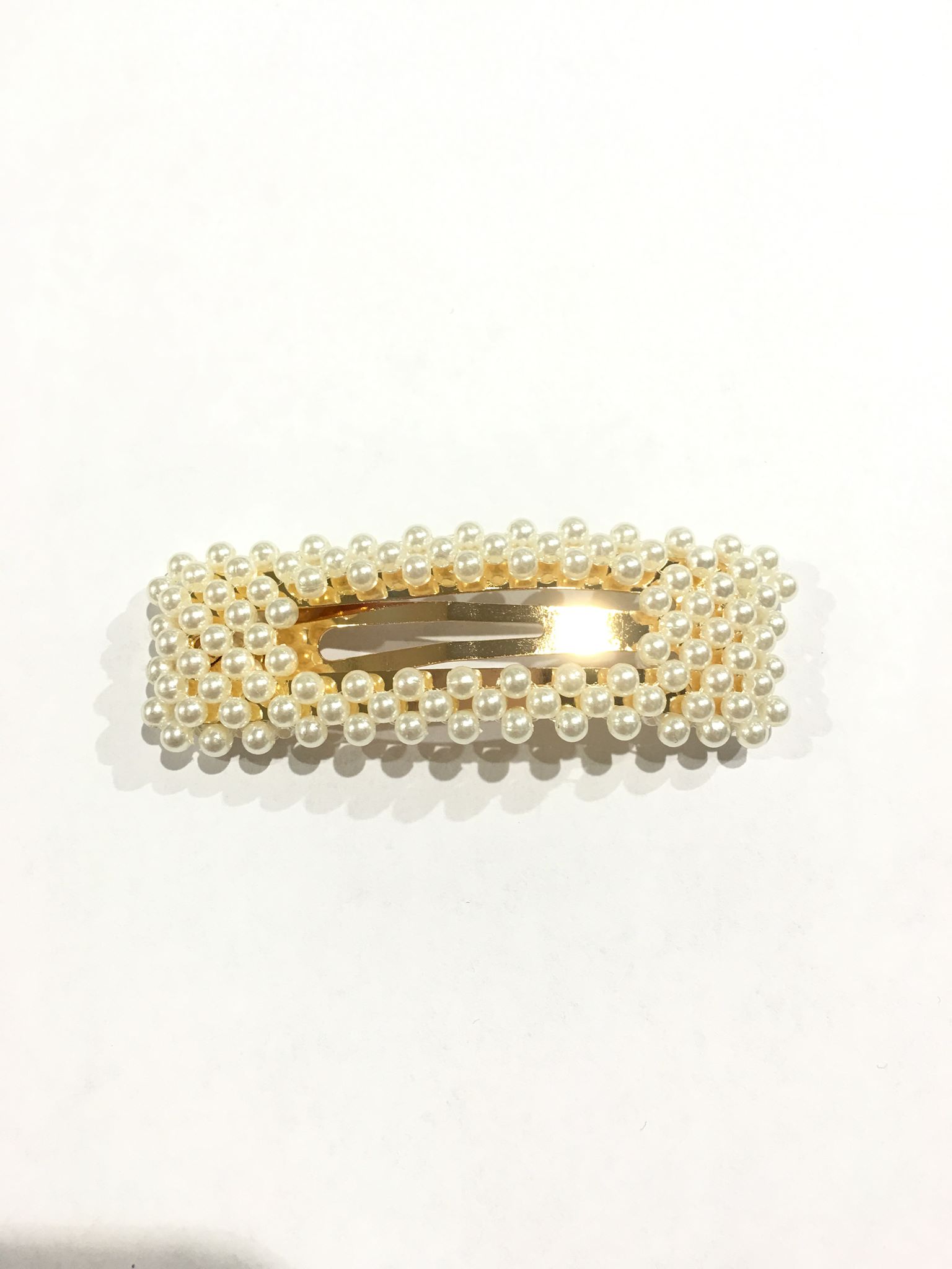 Stor hårspenne med perler fra Nora Norway. Spennen er firkant/rektangel, gull med mange små hvite perler.