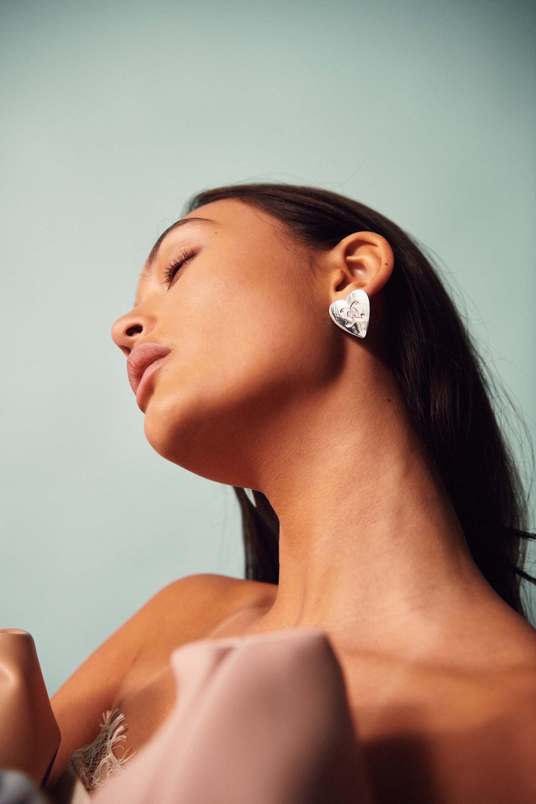 Opplev tidløs skjønnhet med våre Heart Logo Bold Stud-øredobber. Disse fantastiske øredobbene har en større størrelse for et iøynefallende utseende, og er fagmessig laget med logoen vår gravert for et snev av raffinement. Lette og allsidige, disse øredobbene vil garantert bli din nye favoritt til enhver anledning.