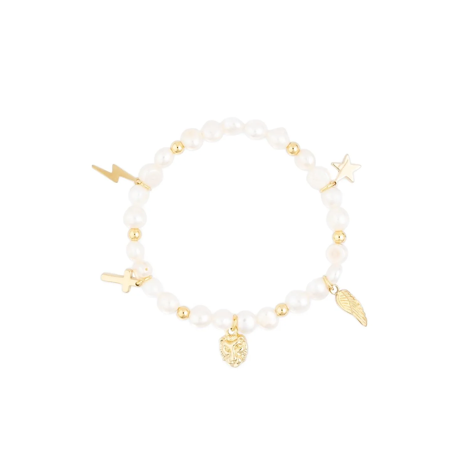 Steinperle-armbåndet er laget med vakre naturlige Kunzite-steinperler. Gjør mye av seg med 5 charms som henger på i gullfarge.